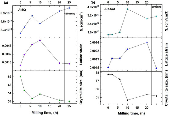 Figure 13a,b depicts how dislocation density (cm/cm3) varies with processing time. This graph shows that dislocation density tends to grow from the start to the conclusion of ball milling processing periods both in the case of Al-5Cr and Al-7.5Cr alloys. This trend is justifiable since dislocations increment is generated by the plastic deformation mechanism induced by the repeated ball-powder-ball collisions that develop during milling.