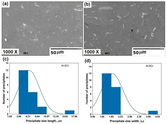 Figure 14a,b exhibits the electron micrographs corresponding to the sintered specimen Al-5Cr. In this case, Figure 14a was obtained by secondary electron image mode and Figure 14b was attained by backscattered electron image mode. These micrographs display bright precipitates with a flake morphology uniformly dispersed in Al matrix. As shown in the Al-Cr binary alloy phase diagram, these compounds appear as a result of Cr’s very low solid solubility in Al. Figure 14c,d exhibits the precipitate size distributions considering its length and width. Derived from these histograms, the mean of precipitate width is 1.7 μm and the mean of precipitate length is 6.5 μm.