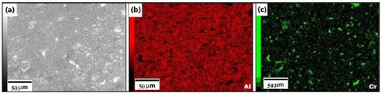 Figure 17a presents the analyzed surface of Al-7.5Cr consolidated specimen, the X-ray mappings of Al and Cr corresponding to this area, are shown in (b) and (c) of this figure, respectively. The elements’ mappings prove a homogeneous dispersion of both Al and Cr among the whole surface analyzed. Figure 17c shows X-ray signals emitted from Cr element. These signals are grouped to form small “clusters”, this behavior is associated with the formation of Cr-rich precipitates in these small regions. In addition, subsection (b) of Figure 17 exhibits that Al is uniformly distributed in the total analyzed surface, it is important to note that dark holes are observed also dispersed in Aluminum, it is essential to denote that in the places where these holes are detected, there is a precipitate rich in Cr.
