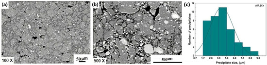 Figure 16a,b exhibits the SEM micrographs corresponding to the sintered exemplar Al-7.5Cr. In this case, Figure 16a was obtained by secondary electron image mode and Figure 16b was attained by backscattered electron image mode. These micrographs display bright precipitates with an irregular morphology with round borders uniformly distributed in Al matrix. However, the volume fraction of porosity increased considerably. The precipitation of these compounds is consistent with the binary alloy Al-Cr phase diagram, since Cr exhibits a low solubility in Al. Moreover, Figure 16c displays the precipitate size distribution of AlxCry precipitates on the Al matrix, where is observed that most of the precipitates have sizes within the interval from 3.9 to 6 µm, with a mean size of 4.3 μm.
