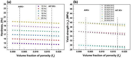 For an Al5Cr specimen with a porosity of 0.003, the m exponent of Equation (3) had no significant effect on σy values. In this regard, the values of σy for this specimen were 39.7, 35.8, and 29.8 MPa, compared to pure Al starting values of 40, 36, and 30 MPa, respectively. On the other hand, Al7.5Cr yield strength values (with a volume fraction of porosity = 0.017) were sensitive to the m exponent in Equation (3). When σy of pure Al was established to 40 MPa, modeling yielded values of 39.7, 35.8, and 29.8 MPa for m = 2, 3, and 4, respectively.