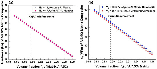 Hardness and yield strength of Al7.5Cr composites were calculated from Equation (4). In this case, the starting hardness of the Al7.5Cr “matrix” was 17.7 Hv (see Figure 20a), and considering a volume fraction of Cr(Al) precipitates of 0.1, the resulting hardness was equal to 42.2 Hv.