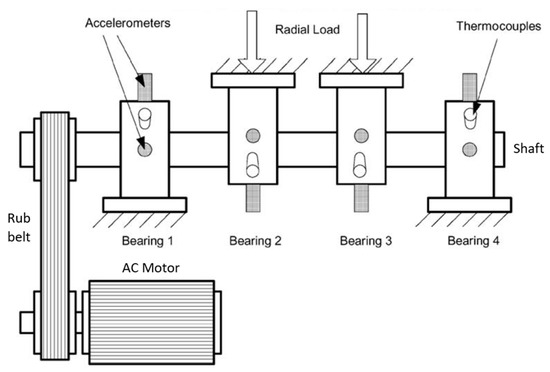 As already mentioned, the signals that will be analyzed come from an open-access dataset released in 2014 by the NASA Center for Intelligent Maintenance Systems (IMS) [33]; the focus is on the results of the first of three run-to-failure experimental campaigns carried out at the University of Cincinnati, OH, USA, with support from Rexnord Corp., Milwaukee, MI, USA.