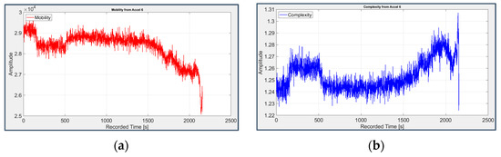 “Mobility” () is related to the variance of the vibration signal velocity, so it is associated to the jerk (first time derivative of the signal) and its dimension is expressed as a ratio per time unit.