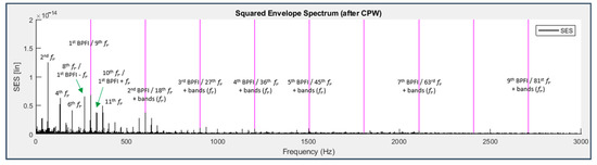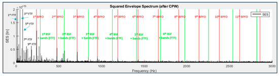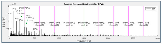 - CPW + SES. Advantages: able to detect the harmonics of the shaft rotation frequency and BPFI for bearing 3 and of the BPFO and BSF for bearing 4 with very low noise. Disadvantages: reduced amplitude of the response peaks.