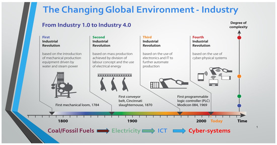 Over the last two decades, we have seen a significant increase in the discussion of the Fourth Industrial Revolution (4IR) among academics and policymakers in both developing and industrialized countries [1]. The 4IR critique is marked by the merging of the real and virtual worlds and the collapse of almost all industries [1,2]. For others, the assembling of cyber-physical systems, cloud technology, the Internet of Things, and the Internet of Services and their integration while interacting with humans in real time to maximize the generation of value is known as the Fourth Industrial Revolution [3]. Some thinkers assert that some old jobs will vanish because of the alleged revolutionary power of 4IR, opening the door for a new array of jobs and markets that will necessitate the creation of new areas of expertise [1,2,3]. The word “fourth” typically implies that there have been three revolutions before the Industrial Revolution 4.0 [3]. Through mechanization and steam engines, the First Industrial Revolution greatly increased the productivity of manufacturing methods. Because there was more electrical power available during the second, assembly lines and mass production became a reality [4,5]. The Third Industrial Revolution saw the widespread adoption of computing and digitalization [6]. The 4IR is currently where we are, and this era is dominated using cyber-physical systems to improve life-sustaining processes such as production works (refer to Figure 1). Growth in automation marked each shift from one revolution to the next [3]. Productivity rose by approximately 50-fold with each revolution, even if many jobs from the previous industrial age were rendered obsolete [7]. All revolutions by their very nature are disruptive, and the preceding three revolutions brought about significant modifications to the economic and social landscape [6,7].