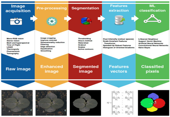 The latest studies of phenomics and high-throughput picture-data gathering are available; however, most of the research on image interpretation and processing can be found in textbooks that dive into extensive detail into the methodologies [14]. Figure 4 summarizes the techniques for image acquisition and processing generally utilized for plant disease detection systems.