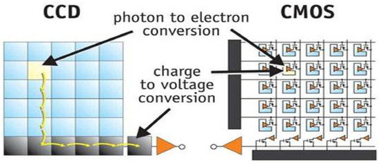 Image collection is the first step in a system for detecting plant diseases [6,8,12]. Image sensors, scanners, and unmanned aerial vehicles (UAVs) can all be used to capture photos of plants [3]. The commonly utilized image-acquisition tools are a charge-coupled device (CCD) and a complementary metal–oxide–semiconductor (CMOS) [15]. Both of these camera technologies convert light signals and protons to digital data, which is then further transformed into a picture [15,16]. However, their methods of turning the light signals into image data vary [16]. In a CCD camera, the light signals are transferred through a series of adjacent pixels before being amplified and converted into image data at the end of these pixel strings [17,18]. This enables CCD cameras to possess minimal degradation during the image-acquisition process [19]. CCD cameras generate sharp pictures with reduced distortion [18]. Contrarily, in CMOS cameras the light signals are collected, amplified, and converted at each pixel of the image sensor [15]. This enables the CMOS devices to generate images faster than CCD devices since each pixel can convert light signals into an image locally [17]. CMOS devices are normally preferred in projects with a low budget since they are cheap compared to CCD devices, have a lower power consumption, and can acquire high-quality images faster than their CCD counterparts [17,18,19]. Figure 5 shows the serial versus localized pixel image conversion of CCD and CMOS image sensors, respectively.