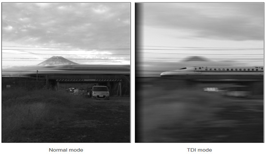 An imaging acquisition tactic known as time delay and integration (TDI) can be combined with either CCD or CMOS technology to drastically improve their image-acquisition capabilities [20]. Applications involving fast-moving objects and requiring high precision and the capacity to function in extremely dim lighting environments use TDI [20,21]. Refer to Figure 6 for an example of a high-speed application of TDI technology in which a high-velocity train was captured with a normal and a TDI-featured camera in the left and right pictures, respectively. When the camera was operated in normal mode, the image of the train was a blur due to its high velocity and dim lighting conditions; however, the incorporation of a TDI mode countered these challenges and produced a clear detailed picture of the train.