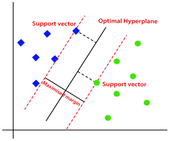 In Figure 10, the optimal hyperplane is used to separate the two classes of data (the blue squares and green circles). The two planes (dashed lines) parallel to the optimal hyperplane are called the positive and negative imaginary planes, which are the planes passing through the closest data points to either side of an optimal hyperplane [72]. These closest points to the optimal hyperplane are called the support vectors and are used to determine the exact position of an optimal hyperplane [73]. There might be several possible hyperplanes, but the optimal hyperplane is the one with the maximum marginal distance, which is the distance between the two marginal planes [72,73]. The maximized margin results in a more generalized solution compared to smaller margins; should the training data change, the algorithm with a smaller margin will have accuracy challenges [73]. In some cases, data classes are not always easily separable with a straight line or place as in the case of Figure 10. Therefore, when data classes show a property of non-linearity, transforming a space in which these data classes occur from a low-dimension (often two-dimensional) into a high-dimension space (often three-dimensional) space using the kernel method. The kernel method is a computation of a dot product of the dimensions in the new high-dimension space [72,73,74]; (17) below gives the general solution of a hyperplane, where is any data point or support vector, is the weight vector that applies the bias of the support vectors, and is the constant [74].