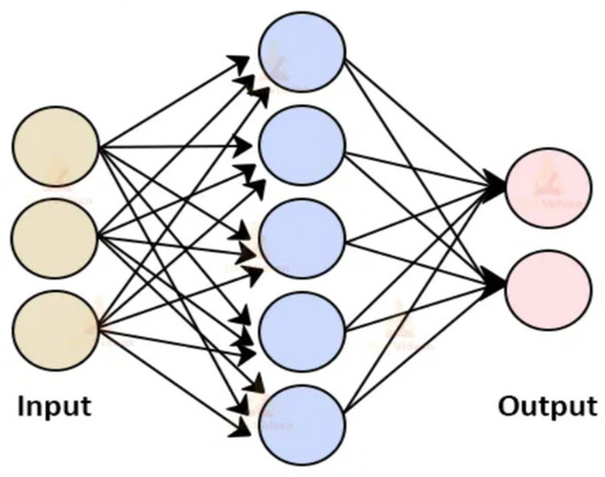 An ANN is a supervised learning model that is a collection of interlinked input and output nodes in which each link has an associated bias value called a weight [75]. A single input layer, one or perhaps more intermediate layers that are normally called hidden layers, and one or more output layers make up the structure of an ANN [75,76]. The weight of each connection is modulated as the network operates to facilitate neural network learning [76]. The performance of the network is enhanced by adjusting the weight continuously [75]. ANN can be divided into two groups based on connection types: feed-forward networks and recurrent networks [33]. In contrast to recurrent neural networks, feed-forward neural networks do not have cycle-forming connections between units [76]. The architecture, transfer function, and learning rule all have an impact on how a neural network behaves [49,76]. The weighted total of input triggers the activation of neural network neurons [75]. Figure 11 shows a generalized model of an ANN model with the input layer, the hidden intermediate layer (purple layer), and the output layer.