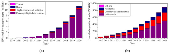 The global growth of EVs and PVs in the last decade: (a) The EV stocks by transport types; (b) The installed capacity of solar PVs with different application purposes.