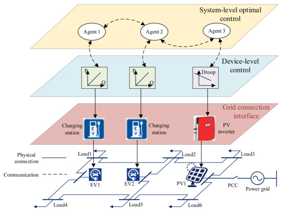 Conventionally, the distribution network voltage regulation is in the charge of the local distribution network operator (DNO) and is conducted in a centralized way with the operational settings of OLTC transformers and SCBs globally optimized. To make EVs and PVs get involved in the voltage regulation of distribution networks, both system-level optimal scheduling of EVs and PVs and device-level control of EV chargers and PV inverters are required, as illustrated in Figure 2. For system-level control, the optimal coordination schemes of EVs, PVs, and conventional voltage control devices have to be defined under the operational constraints of all available voltage support resources and the power grid. For device-level control, the optimal operation modes and operation setting parameters have to be defined to meet the system-level voltage support requirements. Acting as the grid-interaction interfaces, EV chargers, and PV inverters receive the commands from the device-level controller and provide real-time voltage support for distribution networks. The voltage regulation mechanism and the main features of typical voltage support resources available in distribution networks with EVs and PVs are summarized in Table 1.