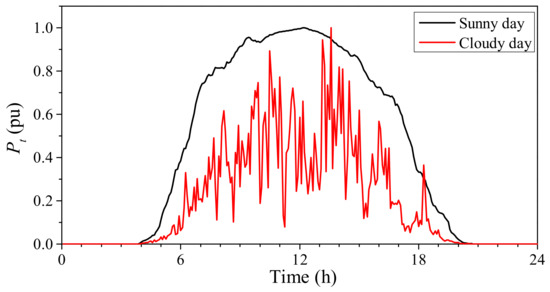 As the grid voltage support capability of PV systems is directly affected by the solar irradiance absorbed by the PV panel, it is necessary to investigate the PV generation profile with the environmental factors considered. Typically, daily solar irradiation follows a Beta distribution as represented by (5), while the power injected into the grid is represented by (6). It can be concluded that the operating power of the PV system almost linearly increases with the increasing solar irradiance, assuming the PV system is operating at its maximum power point. Due to the intermittent features of solar irradiation, the power output (and hence the grid voltage support capability) of the PV system will fluctuate with the varying weather conditions. Figure 4 illustrates the typical PV generation profiles of a PV system operating on a sunny day and a cloudy day.
