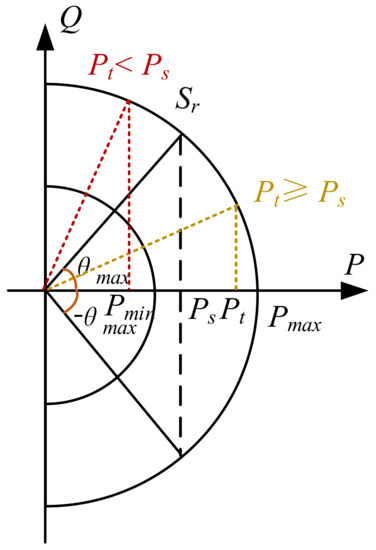 PV systems are connected to distribution networks via power electronic converters, which can real-time monitor and control the current injected into the grid. By adequately adjusting the control circuits, PV inverters can provide a bidirectional reactive power exchange between the device and the distribution grid. This makes them ideal reactive power support resources for the voltage regulation of distribution networks. As PV operating power fluctuates with the varying solar irradiations absorbed by the PV panels and the operating power factor of PV systems has to be above a specific threshold value (e.g., 0.9), the reactive power control capability of a PV inverter at time instance t is determined by its operating power Pt, its minimum and maximum operating power Pmin, and Pmax and its minimum power factor pfmin (corresponds to a maximum phase angle difference between grid voltage and grid current, θmax). As illustrated in Figure 5, the maximum reactive power can be achieved when Pt equals Srcos(θmax) (denoted as Ps and Sr is the rated power of the PV system). When Pt is greater than Ps, the maximum achievable reactive power, Qmax,t, equals (illustrated by the yellow triangle in Figure 5). When Pt is less than Ps, the maximum reactive power equals Pttan(θmax) to ensure the power factor, pft, is no less than pfmin. To sum up, the maximum achievable reactive power at time instance t, Qmax,t, equals when Pt is within the range of [Pmin, Pmax]. Equivalently, the minimum power factor at time instance t, pfmin,t, equals .