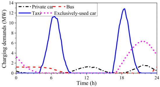 Based on the characterization of EV traveling patterns in Table 1, the daily charging demands for the four types of EVs can be estimated via the Monte Carlo approach. For each type of EV, the random sampling of the initial battery SoC and the EV arrival time to the charging station is first applied by using the probability distribution parameters tabulated in Table 1. By applying the Monte Carlo approach, 1000 diversified charging profiles are generated for each type of EV, with their aggregate charging profiles forming the daily charging demands, as illustrated in Figure 7. It is observed that different types of EVs have their unique patterns of charging demands, indicating that they may present a difference of potential in the application of grid voltage support.