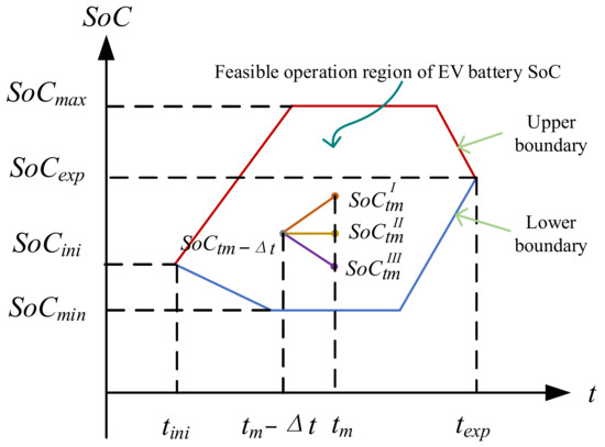 Regarding the SoC constraints, the feasible operation region of an EV battery SoC is illustrated in Figure 8. For an EV connected to an EV charger at time instance tini, its upper and lower boundaries of EV battery SoC are marked by the red curve and the blue curve in Figure 6, respectively. For the upper boundary, the EV will be first charged to its maximum SoC, SoCmax, at maximum charging power, Pr, and then kept constant at SoCmax, followed by being discharged to the user-expected battery SoC, SoCexp, at a power of Pr. Similarly, for the lower boundary, the EV is first discharged to the lowest battery SoC, SoCmin, at maximum discharging power, Pr, and then kept constant at SoCmin, followed by being charged to SoCexp at a power of Pr. The upper and lower boundaries of EV battery SoC at time instance tm can be represented by Equations (15) and (16).