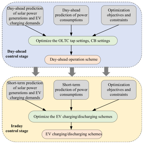 The conventional voltage regulation resources in distribution networks include the OLTC transformers and the shunted CBs, which are featured by slow response and limited daily action times. By contrast, PVs and EVs are connected to the grid via power electronic converters, making them capable of real-time controlling their reactive powers. To fully exploit the voltage control capability of EVs and PVs, a two-stage coordinated EV and PV control scheme for the grid voltage regulation is proposed in this section, with its general framework illustrated in Figure 9. The coordinated EV and PV control scheme is divided into two stages-the day-ahead control stage and the intraday control stage, which will be discussed in the following subsections.