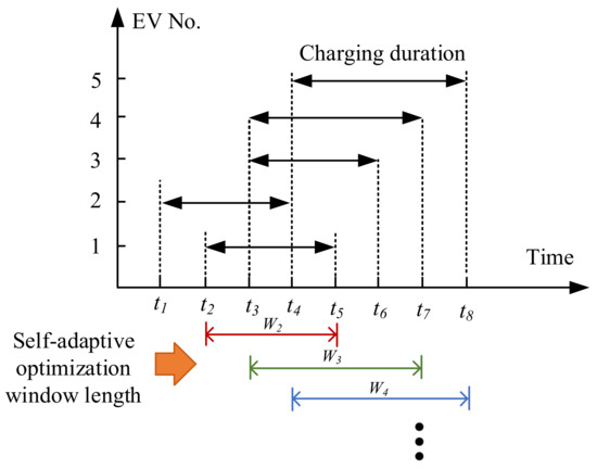 The optimal daily operation settings of OLTC transformers and CBs obtained from the day-ahead control stage are the predefined variables during the intraday control stage. The PV systems and EVs act as supplementary voltage regulation resources. The PV systems are always grid-connected, and their voltage regulation capability is achieved using the device-level reactive power control, with the control range mainly determined by the operating power level (and hence the solar irradiation level). For the EV fleet, its voltage regulation capability is achieved with the real-time charging/discharging scheduling under the constraints of EV battery SoC. Due to the diversified travel patterns of EV users, the operating condition of any individual EV charger will vary with time, which will directly affect its charging/discharging schemes and hence its voltage regulation capability. Accordingly, a rolling-optimization-based control scheme (ROCS) is proposed for the EV charging/discharging scheduling and is characterized by self-adaptive optimization window length, as illustrated in Figure 3. Specifically, assuming 5 EVs will be connected to an EV charging station at different time instances with diversified charging durations, the selected optimization window length for each time slot also has to be dynamically adjusted depending on the time-varying EV availability for the grid voltage support. For any time instance, the EV is either already connected to the charging station for a certain time or is just connected to the charging station. As illustrated in Figure 10, only EVs 1~2 are grid-connected at time instance t2, while EVs 1~4 are grid-connected at time instance t3. Based on the information on EV availability at a given time instance and the expected departure time of EV users, the optimization window length at the specified time instance can be defined by (29).