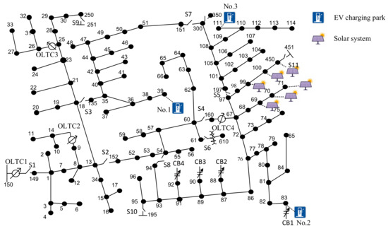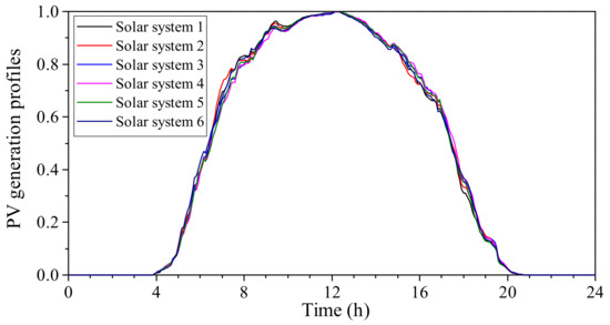 The single-line diagram of the IEEE 123-node test feeder is shown in Figure 11, with three EV charging parks and six solar systems integrated. The power ratings for a single EV charging park and single solar system are 600 kW and 200 kW, respectively. To take into account the impact of preliminary load demand variation on the grid voltage profiles, selected residential load profiles are randomly distributed to the default loads, as in Figure 12. Figure 12 also denotes that the distribution network has the highest preliminary power consumption during the period of 7 p.m. to 11 p.m., which overlaps with the charging peak period of EVs. The EVs gathering to charge at peak hours can result in under-voltages issues and the overloading of power transformers and distribution cables. The typical PV generation profiles applied to the six solar systems are illustrated in Figure 13, assuming all the solar systems are operating on a sunny day. It is observed from Figure 13 that the solar systems have the highest power generation during the period of 10 a.m. to 2 p.m., which may mitigate the grid congestion due to EV charging. All applied daily load profiles and PV generation profiles are taken from a database disclosed by a UK DNO [41]. To provide the grid voltage support, all six solar systems are characterized by a voltage droop control, as described in Figure 6. The minimum allowed power factor for all solar systems is 0.9 (leading or lagging).