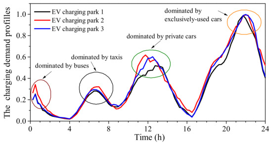 Based on the Monte Carlo simulations conducted in Section 2.3.1, it is expected that each EV charging park with a power rating of 600 kW can accommodate up to 250 EVs per day. To emulate the uncontrolled EV charging behaviors, it is assumed that 700 EVs are connected to three EV charging parks with a combination of different arrival times and charging durations. All EVs are charged at unity power factor without considering the power losses during the charging process. As EVs of different transport types are featured by diversified charging patterns, it is assumed that all the 700 EVs are made up of private cars, buses, taxis, and exclusively-used cars, with their percentage share equaling 85%, 2%, 5%, and 8% respectively. Each EV’s arrival time, initial battery SoC, battery capacity, type of charging, and charging period are randomly generated from its typical charging pattern, as defined in Table 1. All the EVs have the V2G capability and can provide bidirectional active power flow between the power grid and the EV battery. It should be noted that the lithium-ion EV battery enters into constant voltage charge mode with a significantly slow charging speed when the EV battery SoC is above a threshold value of around 95%. Therefore, the expected EV battery SoC after charging is assumed to be 95%. For unregulated EV charging, all EVs are charged at their rated charging power once they arrive at the EV charging parks, with their aggregate daily EV charging demand profiles illustrated in Figure 14. It is noticed that the diversity of EV types results in several spikes in aggregate EV charging demands during the day. When those spikes are superimposed on the peak power consumption of preliminary loads, the bus voltages may drop below the safe margin. To address this issue, six OLTC transformers and four capacitor banks are deployed, and their basic information can be found in [42]. The minimum and maximum bus voltages are 0.95 pu and 1.05 pu, respectively. The optimization problems associated with the two-stage voltage control are solved with a modified JAYA evolutionary algorithm, with its details provided in [43].