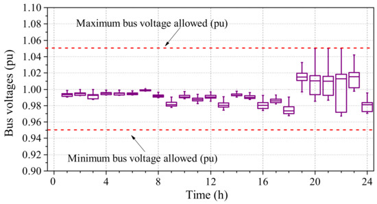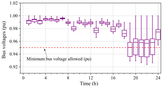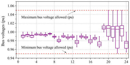 To further improve the voltage profiles, intraday control has to be applied with the voltage support capability of solar systems and EV charging stations. During the intraday control stage, the control objects are the six solar systems and the 700 EVs, while the OLTC transformers and the CBs are operating at their optimal operating curves achieved from the day-ahead control (i.e., the operation settings in Figure 16). The grid voltage support is based on the voltage droop control of solar systems and the ROCS-based EV charging/discharging schedule. When the intraday control is not applied, all solar systems operate at a unity power factor, and EVs are charged without a schedule. The boxplot represents the corresponding simulation results of bus voltages in Figure 18, where the voltage limit violations are observed.