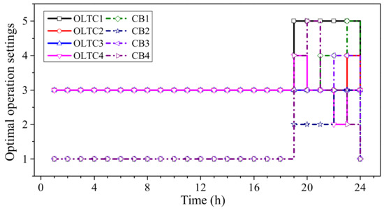 By applying the modeling procedure of the day-ahead control given in Section 2.4.1, the optimal operating curves for the OLTC transformers and CBs can be derived, as illustrated in Figure 16. According to [44], the switching action costs of OLTCs and CBs are assumed to be 1.4 USD/time and 0.24 USD/time, respectively, while the marginal cost of the power losses is set at 80 USD/MWh. The grid voltage distribution pattern with the day-ahead control being applied is shown in Figure 17. Comparing the grid voltages before and after the day-ahead control, it turns out that the day-ahead control successfully brings the bus voltages back to the safe operation margin (i.e., 0.95~1.05 pu) during the period of peak power demand, even though certain bus voltages are close to the boundaries.