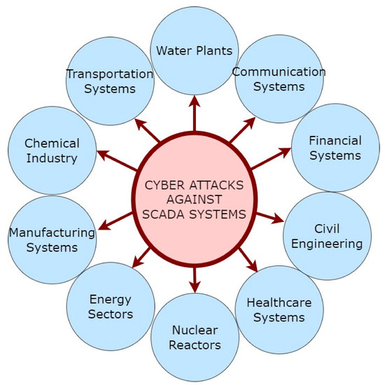 Most structures where SCADA systems are used have not direct connections to the internet and work independently from external networks. Developing technologies expand the area of internet usage, and this situation also affects SCADA systems. Innovations such as the co-usage of different technologies and remote accessing the system via the internet create new cybersecurity problems for SCADA systems. SCADA systems, which cannot keep up with the developing technology, have many architecture-related security problems. For example, the frequently used Modbus protocol has many vulnerabilities that can be attacked, such as by a man-in-the-middle, command injection, and denial-of-service (DoS) [8,9,10]. SCADA systems in different sectors become attractive targets for malicious people who are aware of these situations and work in the national or international arena. Figure 1 shows the sectors where SCADA systems serve. Each can contain various threats that malicious applications can attack.