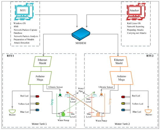 SCADA systems consist of a master terminal unit (MTU), remote terminal units (RTUs), and a communication network. The MTU controls the processes in the system using a human–machine interface (HMI). There is data exchange and command transmission between RTUs and MTU. RTUs transmit the data collected from the field sensors to the MTU, and RTUs carry out the commands from MTU. Modbus, DNP3, and Profibus communication protocols—specific to SCADA systems—are used for communication between basic units. The sensors and actuators on the RTUs abide by the commands. Elements such as pumps and relays serve as actuators. The HMI also demonstrates the data obtained from the sensors [6,7].