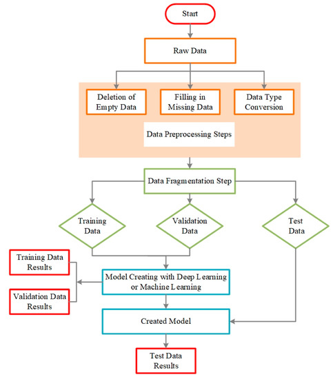 This section concerns turning the dataset into an analyzable state and designing the appropriate models, which Figure 4 summarizes. Several data pre-processes were determined to make the dataset analyzable. The primary operations were deleting attributes and instances deemed unnecessary or containing too many null values. The next step was completing the attributes containing missing data using the mean method. Another process is to convert data types to the same type using categorization processes. In the end, a dataset with 25 features was obtained.