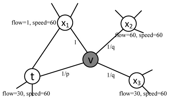 As shown in Figure 2, the traffic flow and traffic speed on the nodes represent the dynamic attributes of the link nodes. The connection relationship between nodes represents the static attributes of the link nodes. In terms of static features that affect the walk, the label values on the edges characterize the control parameters of the next link node passing link node . Where the control parameter for returning to the previous link node is . The control parameter for exploring further nodes such as link node and is . The control parameter for exploring other link nodes such as link node is 1. In terms of dynamic features that affect the walk, link nodes with higher traffic flow and lower traffic speed are found to have a higher transition probability. For instance, in the case of link nodes and , the transition probability from to is higher than from to . Conversely, for link nodes and , the transition probability from to is higher than from to .