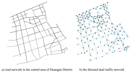 We constructed a directed dual traffic network in the central area of Huangpu District using the data sources described above, as illustrated in Figure 3. This network comprised 277 road link nodes and 769 edges. By integrating the AVI data, we were able to obtain the traffic flow and average speed of each road link during a specific time interval.