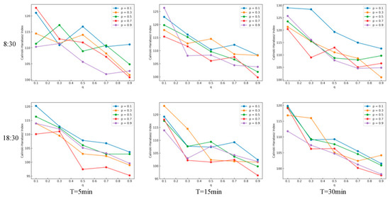 Figure 5 displays the variation of CHI as the static and dynamic characteristic control parameters and change. These parameter variations reflect the model’s attention to the traffic network structure and traffic information during the random walk. For T = 5 min and T = 30 min, the CHI curve generally increases as the static control parameter increases, indicating that larger values of lead to better clustering effects and higher CHI values. However, for T = 15 min, the curve shows fluctuations, indicating that parameter adjustments are necessary to achieve optimal results. The curves of different colors in the figure represent different parameters . In general, the models obtain better clustering effects when , and no significant shift in the curve is observed when . The same dynamic control parameter has different CHI values at different time intervals during different time periods, indicating that the effect of clustering changes with time periods and intervals. These findings demonstrate that the proposed model successfully captures the dynamic features in the urban traffic system during the learning of road link information. In practical applications, the optimal value needs to be determined by adjusting the parameters.