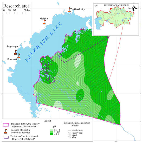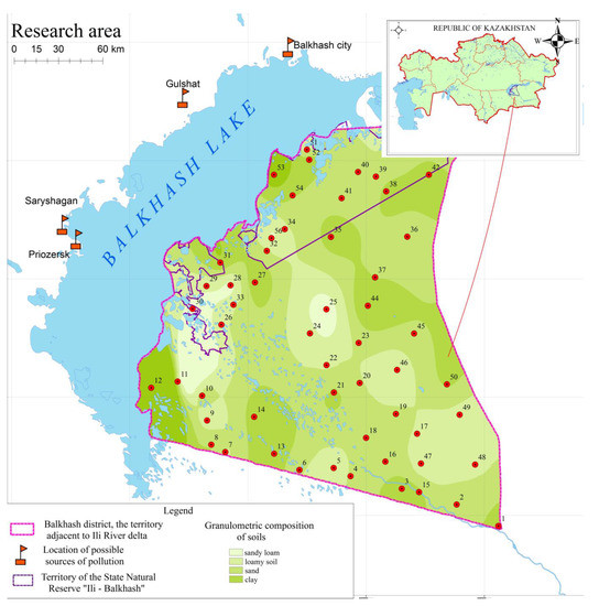 The technogenic intake of heavy metals by industrial waste (aluminum, copper-zinc, lead, nickel, mercury and other plants) in the study area is especially dangerous, for instance, because of waste from the industrial enterprises LLP Balkhash Tuz, Balkhash CHPP, Kazakhmys Corporation, etc.), landfills for disposal of hazardous waste and warehouses for the incineration of hazardous industrial waste, which all are enriched by metals. Scattering areas of heavy metals appear around industrial and manufacturing enterprises also due to emissions into the atmosphere [9]. The maximum soil contamination was observed in the zone up to 5 km from the enterprise, and 10–30% of the total amount of metal in the emission is spread over distances of more than 10 km [10]. Long-range transport occurs as a result of aerosol emissions entering the atmosphere from technogenic sources, which are distributed in the landscape due to the influence of natural factors [11,12,13,14,15]. Pollutants such as heavy metals do have a different distribution tendency in dependence on their chemical and soil properties. In most cases, they tend to accumulate in soils because of their own positive charge and the negative charge of humus and clay minerals.