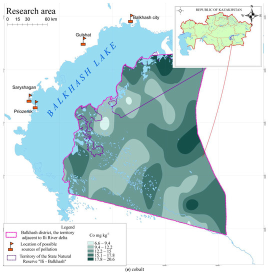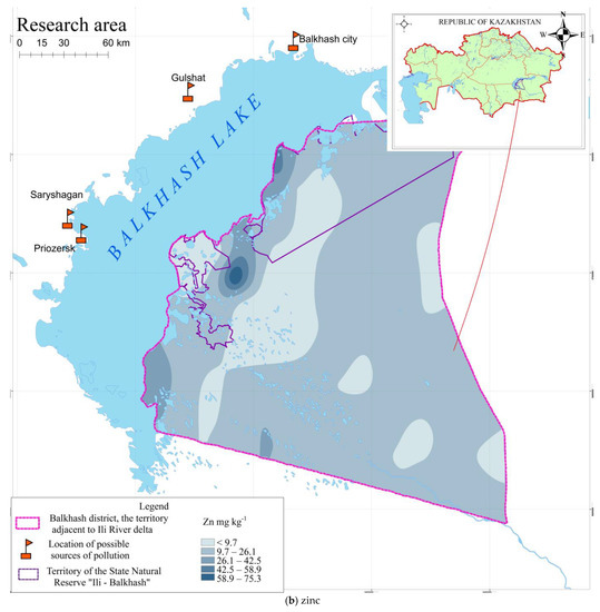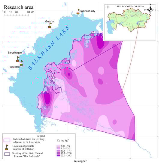 The visualization of the spatial distribution of the metal content of the soil cover reflects the influence of the Balkhash metallurgical plant and other sources of pollution located on the northern shore of Lake Balkhash. Although some of the metal concentrations are lower than in other polluted areas of the world, currently, the study area is experiencing a technogenic load, which in the future may lead to an ecological crisis and the disruption of the natural balance. This crisis can negatively affect plans for the reintroduction of the Turanian tiger to the natural reserve of “Ili-Balkhash”. That is why continuous monitoring of the metal load in the soils of the study area is recommended. Political and technological decisions and innovations must be realized to prevent further pollution. Specifically, in terms of heavy metals, it is always better to prevent their distribution in the environment and impact due to the fact that their withdrawal or transformation is nearly impossible.