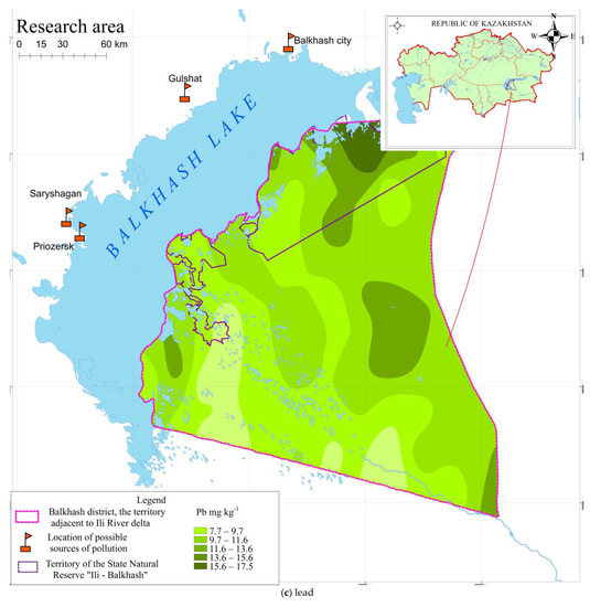 The concentration of lead was lower than the MPC, with a range from 8.0 to 15.9 mg kg−1. The maximum values were recorded up to 14.0–15.9 mg kg−1 in the central and eastern parts and also in the coastal zone of Balkhash Lake. The highest lead concentrations in the soil samples could be localized to the rice fields (Bereke village), but they have low average values (Figure 3c) [41].