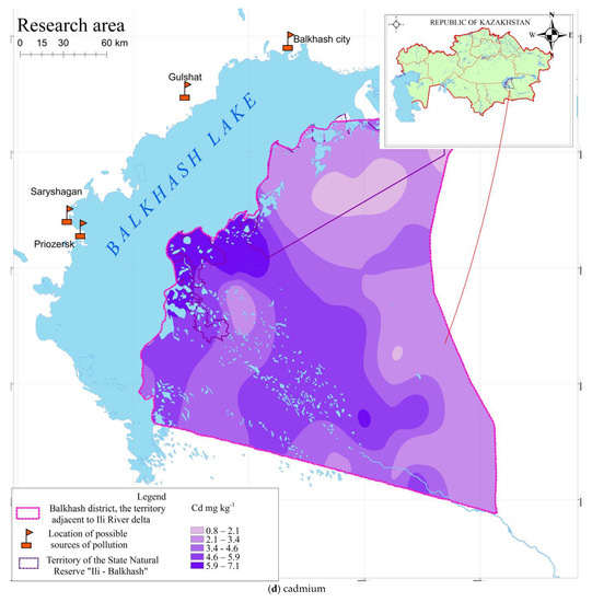 Cadmium concentrations higher than the standard were recorded throughout the study area, with values from 2.1 to 6.5 mg kg−1 for locations distributed across the village of Karaoi to the coast of the Balkhash Lake (up to 3.3 MPC), from the central to the southwestern part (up to 3.1 MPC) (Figure 3d). The soils of the northeastern part are less contaminated with cadmium, with a concentration of 0.9 to 2.0 mg kg−1. According to some authors, an increase in cadmium concentration is directly related to soil pH, which affects the active migration ability of the metal [51,52].