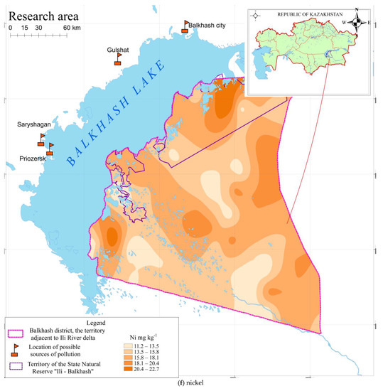 An amount of copper from 7.1 MPC to 8.6 MPC has been recorded throughout the whole coastal zone of Balkhash Lake. In the rest of the study area, the copper content ranges from 6.1 to 19.4 mg kg−1. Local soil contamination due to mobile forms of copper, which is clearly expressed in the central and eastern parts of the study area, is up to 12.9 and 16.1 mg kg−1, respectively (Figure 3a). The copper content in the soils on the left bank of the Ili River is, on average, 8.3 mg kg−1, which corresponds to 2.8 MPC. Copper values exceed the standards by up to 6.5 MPC in the soil cover of Bakanas village. The same observation of high copper contents was found within the limits of the southwestern Balkhash region in the soils of the dry steppe, the semi-desert zones, by up to 28.5 mg kg−1 [50]. This fact indicates the anthropogenic impact on soil pollution.