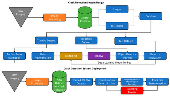 The main goal of this article is to present an automated system for the automatic detection and evaluation of distress on a concrete runway through artificial intelligence using aerial imagery. The system includes runway image acquisition through UAV, captured image data processing for dataset creation, crack labeling, deep learning model design based on the YOLOv2 object detector, its training, and performance evaluation. The system was tuned until the required accuracy was reached and was sequentially deployed into live operation. Once the crack was detected, its position and size were computed by counting individual pixels in a binary image (Figure 1). The transverse crack was selected as the main component to verify the functionality of the system.