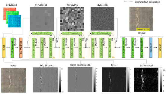 The bottleneck blocks in the ResNet-50 architecture are composed of three convolutional layers with filters of size 1 × 1, 3 × 3, and 1 × 1, respectively. The convolutional layers with a stride of 2 perform the downsampling (conv3_1 and conv4_1), and batch normalization is carried out after each convolution before ReLU activation. The ResNet-50 has two variants of bottleneck blocks: the identity shortcut and the projection shortcut. The convolutional layers in the identity shortcut are connected to skip connection input; this block can be directly used when the input and output feature maps have the same dimension. The projection shortcut has an extra convolutional layer with a filter of size 1 × 1 present on the skip connection. When the dimensions change, there are two options: first, the shortcut still performs identity mapping, with extra zero entries padded for increasing the depth, or second, an extra 1 × 1 convolutional layer is used to match the dimensions. The deeper layers of the ResNet-50 feature extraction network (fifth stack, average pooling layer, fully connected layer, and softmax layer) were replaced with the YOLOv2 detection subnetwork. Thus, in this case, the ResNet-50 outputs feature maps that downsample the input image by a factor of 16 (224/16 = 14 × 14).