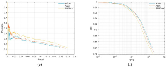 Comparison of the precision-recall curve (left side) and Log-average Miss Rate (right side) for the different optimizers and threshold values for the transverse crack YOLOv2 detector: (a,b) t = 0.25; (c,d) t = 0.50; (e,f) t = 0.75.