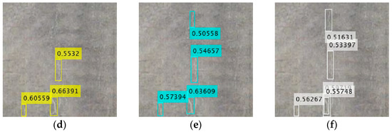 Detection chart of the YOLOv2 with ResNet-50 for two 224 × 224 images containing the transverse cracks for (a,d) SGDM; (b,e) Adam; (c,f) RMSProp optimizers.