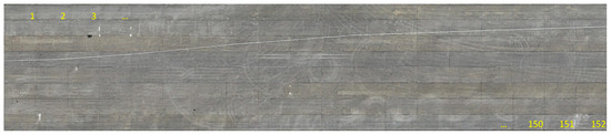 The image data comprise the orthomosaic in which bounding boxes with the transverse crack are marked. The resolution (Table 4) of the orthomosaic (Figure 7) and its size, which reaches 63.8 MB, requires a high-performance computer to view. Thus, a simple vector graphic containing all of the essential image data was created to view the information even on less powerful computers. This graphic contains a grid of marked concrete slabs, where the bounding boxes with the transverse crack are displayed and labeled (the serial number of the crack). A detail of this graphic can be seen in Figure 11. The last way the image data were presented is in a detailed image of individual concrete slabs (Figure 16), indicating the scale where the bounding boxes with the transverse crack are displayed.