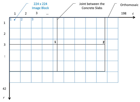 Once the coordinates of all the slabs within the orthomosaic were computed, 224 × 224 image blocks were assigned to the specific concrete slab; however, when a joint was across the 224 × 224 image block, the correct assignment could not be accomplished. For this reason, it was necessary to recalculate the transverse crack bounding box(es) coordinates from the 224 × 224 image block to coordinates within the orthomosaic. Furthermore, the transverse crack bounding boxes were labeled with a serial number during the recalculation. Although using an Adam optimizer in the YOLOv2 detector considerably reduced the number of multiple detections in a transverse crack, they still occasionally occurred. In these cases, the overlapping bounding boxes were reduced to one bounding box with coordinates covering the maximal values of all participating bounding boxes.