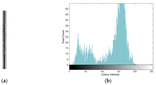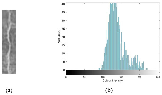 (a) A grayscale image containing a transverse crack cropped from an orthomosaic based on the predicted bounding box coordinates as an example of two homogeneous objects; (b) The corresponding histogram with only a significant single peek.