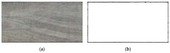 (a) Example of a concrete slab cutout from the orthomosaic as an RGB image; (b) The result of image segmentation and morphological operations to determine the boundary and coordinates of the concrete slab.