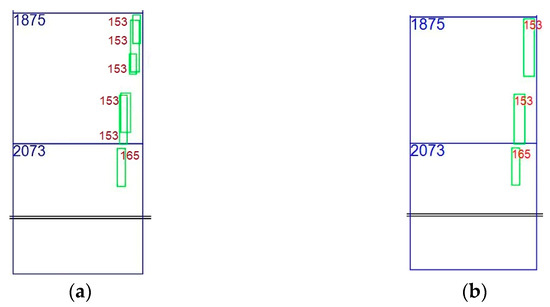 The effect of the bounding box reduction is illustrated in Figure 11. Blues squares represent 224 × 224 image blocks in the square grid with their serial number. Green rectangles are predicted bounding boxes with their serial number (red), and the black lines are the boundary between the concrete slabs; i.e., the joint.