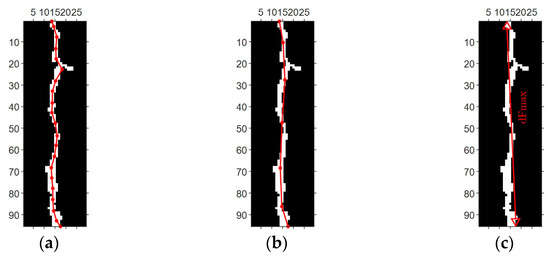 The transverse crack length measurement within the binary image of size 29 × 95: (a) The division into nineteen blocks each of size 29 × 5; (b) The division into five blocks each of size 29 × 19; (c) Application of the maximal Feret diameter dFmax.