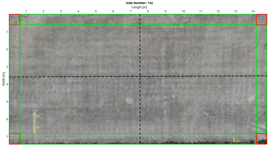 The knowledge of the coordinates of each concrete slab and the coordinates of the transverse crack bounding box(es) within the orthomosaic allows for the correct assigning of the transverse crack to a particular concrete slab. Furthermore, each concrete slab is conceptually divided into four quadrants, two longitudinal and two transverse edges, and four corners. The size of each quadrant is half the width of the concrete slab and half its height. The corners have the size of a square with side dimensions of 0.6 m. The longitudinal and transverse edges are between corners, and their width corresponds with the size of the corner.