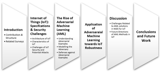 This article investigates the application of AML concepts within the IoT context. It surveys the current trends of AML within the IoT environment considering the most reputable science databases such as Springer [8], IEEE Xplore [9], arXiv [10], ScienceDirect [11], and Research Gate [12]. The framework adopted for this survey is given in Figure 1. Network Intrusion Detection Systems (NIDS) require real-time analysis of sensitive data which reflects the robustness and security needs. Only fifteen papers address those topics. This indicates the sacristy of research studies toward the intersection between those two fields. The analysis of these works reveals the effectiveness of AML crafting techniques in enhancing ML-based NIDS models. Moreover, the defense mechanisms have not been explored sufficiently with a considerable lack of benchmark datasets. The structure of this manuscript is illustrated in Figure 2. As seen, it includes the following: Section 2 introduces the main specifications and security challenges found in IoT networks.